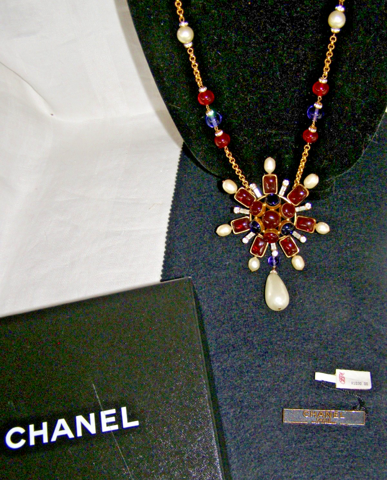 VINT. 1993 CHANEL STARBURST GRIPOIX+DROP PEARL LARGE PENDANT LONG NECKLACE+TAGS+