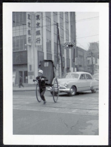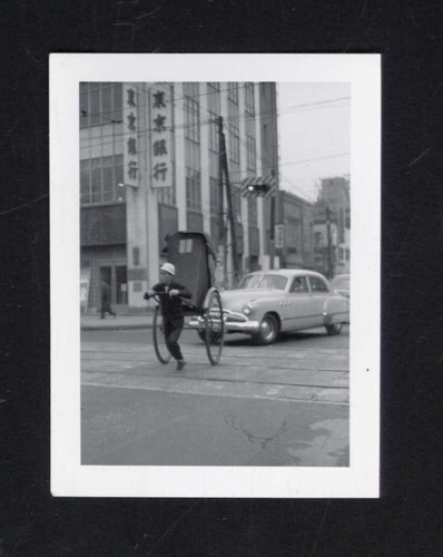 SNAPSHOT from ALBUM* Hong Kong? street corner MAN pulling cart CAR bank building