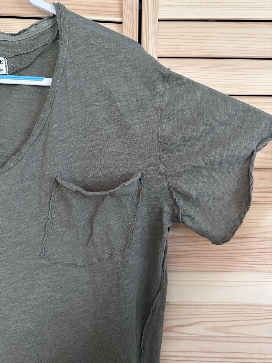 The Free People We The Free All I Need Oversized T Shirt in green is a versatile and comfortable piece perfect for casual occasions. Made from a lightweight and breathable linen blend, this relaxed fit shirt features a V-neck and short sleeves for easy wear. Ideal for summer, fall, and spring, this bohemian-inspired top is a classic addition to any wardrobe, offering a laid-back yet stylish look. The oversized and breathable fabric ensures a comfortable and flattering fit for a medium size.