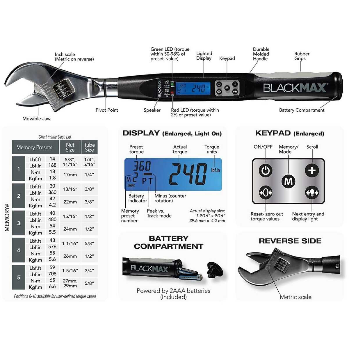 Memory Presets: 5 common, 5 open for custom torque values
