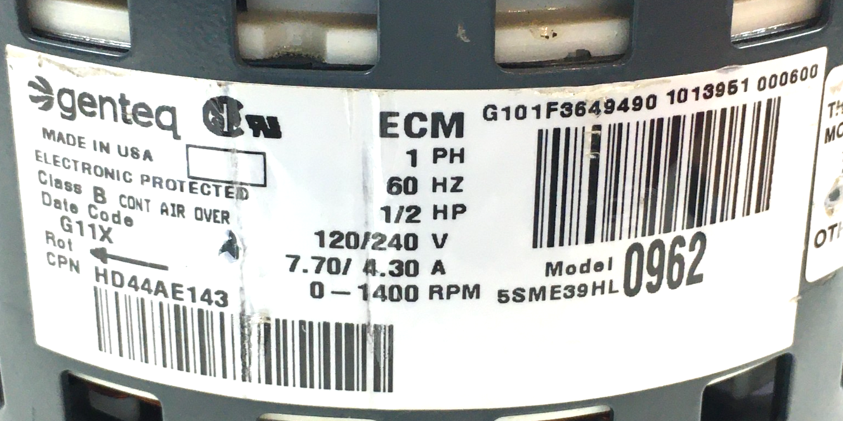 This is GENTEQ ECM2.3 CN04 5SME39HL0962 Blower Motor HD44AE143 1/2HP 120/240V CCW LE rotation used part.