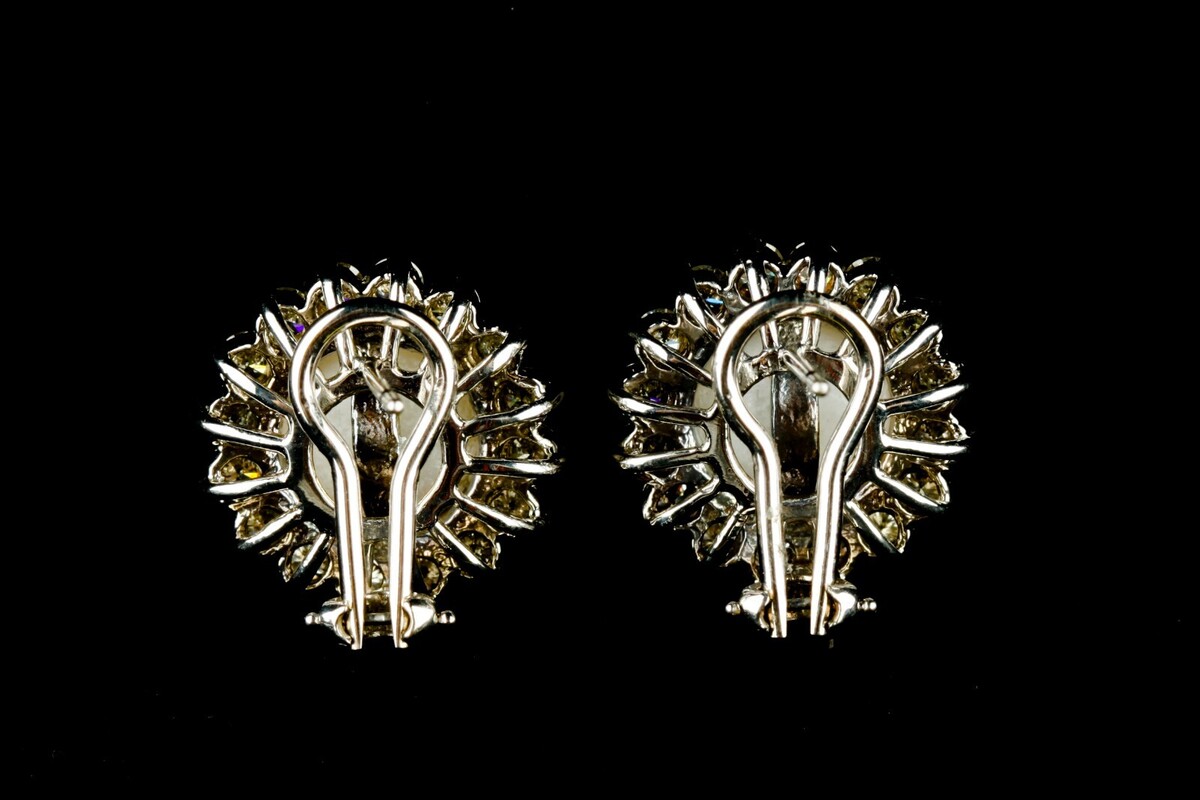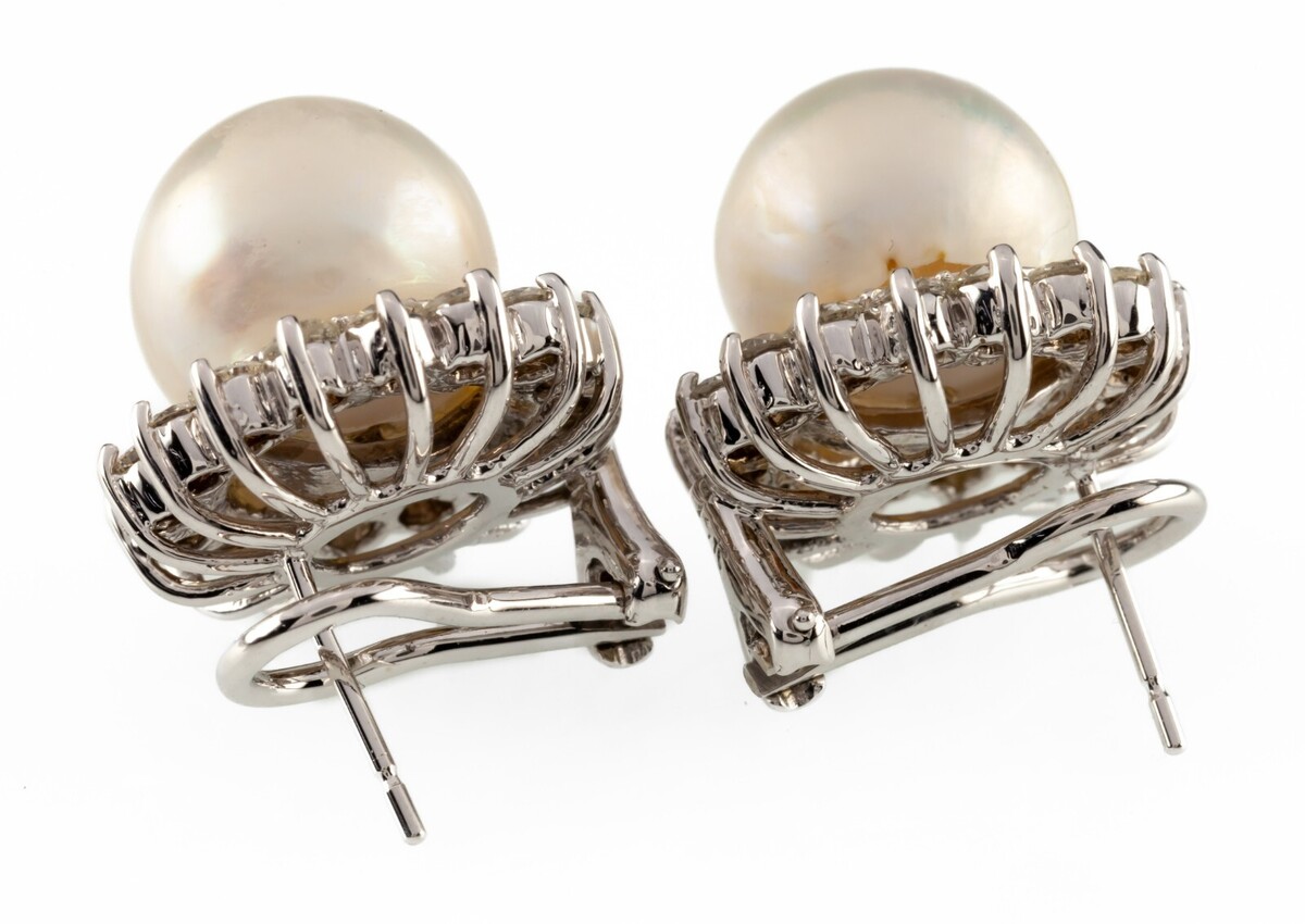 One pair electronically tested 14KT white gold cast assembled South Sea cultured pearl diamond earrings with omega backs.