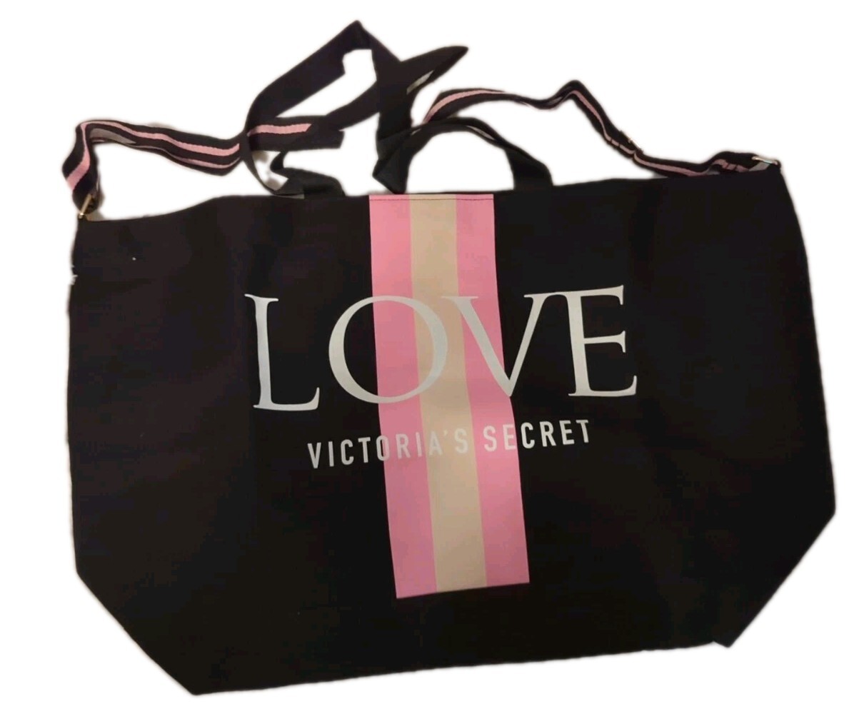 The Victoria's Secret Love Weekender Large Tote Bag in black with pink stripes is a versatile and stylish accessory perfect for various occasions. This rectangular bag features a zip closure, double handles in black and pink with white stripes, and a gold hardware accents. The canvas fabric with a nylon lining adds durability and convenience. With its adjustable shoulder strap and large size, this tote bag is ideal for travel, weddings, parties, or casual outings, making it a must-have for any fashion-forward woman.