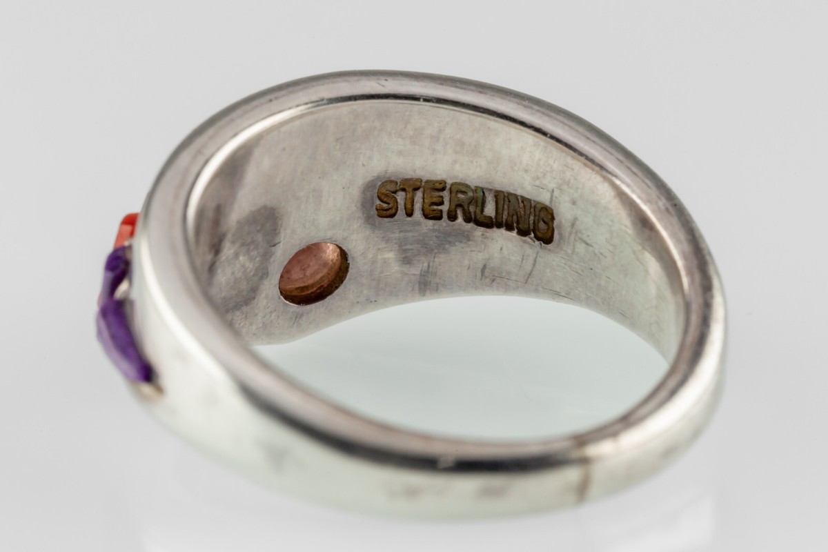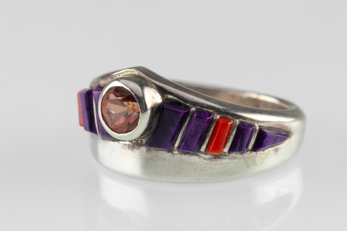 Gorgeous Sterling Silver Band Ring with a mix of Purple Spiney, Coral and Morganite Center Stone.
