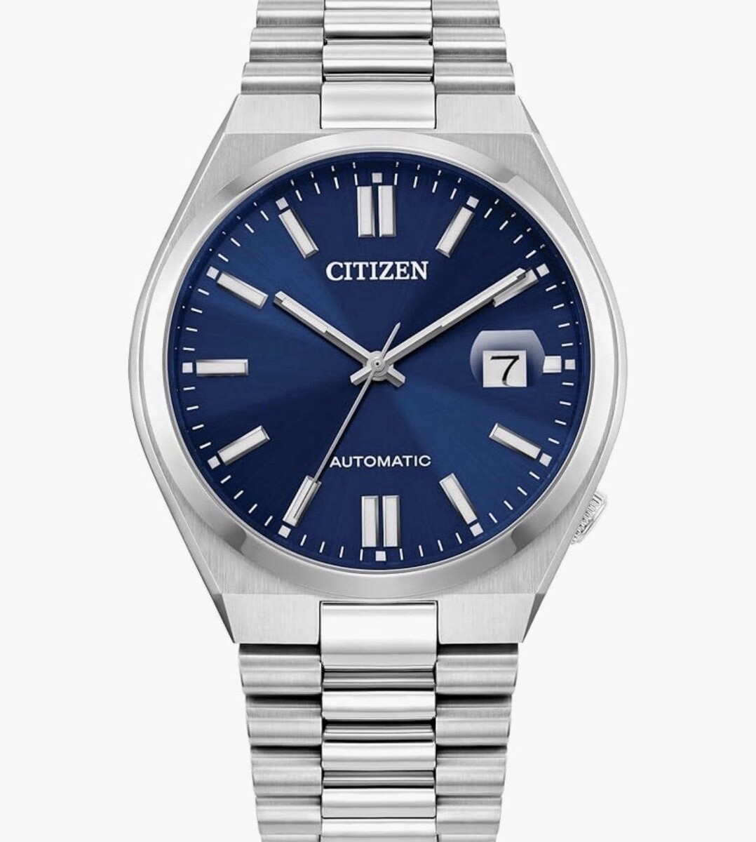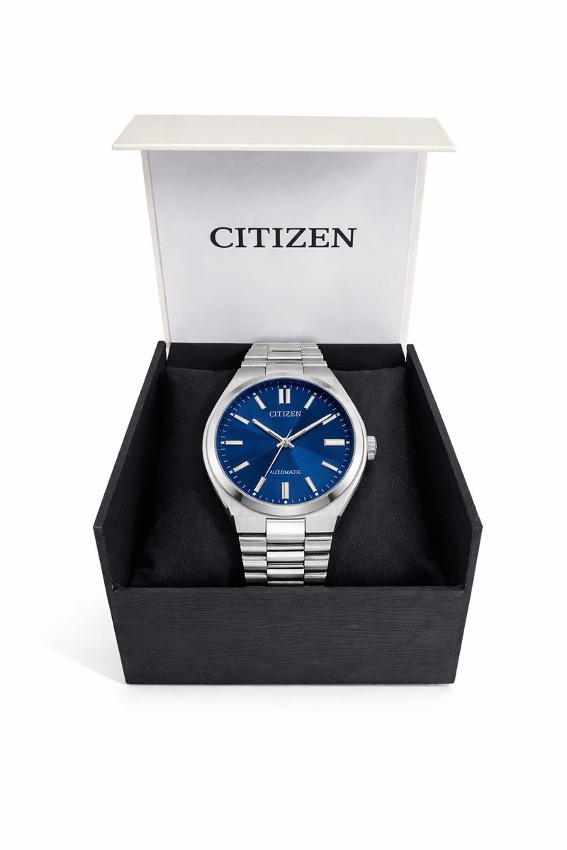 Stylish Citizen watch featuring a deep blue dial. Silver-tone bracelet adds elegance, Modern and sophisticated style.
