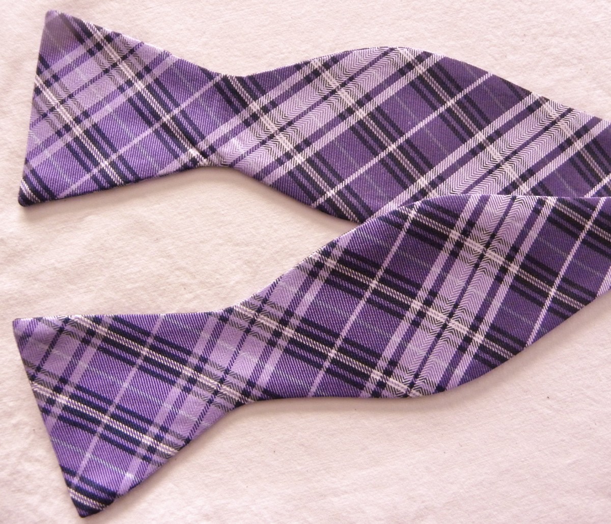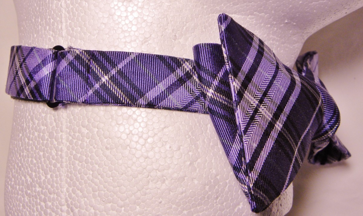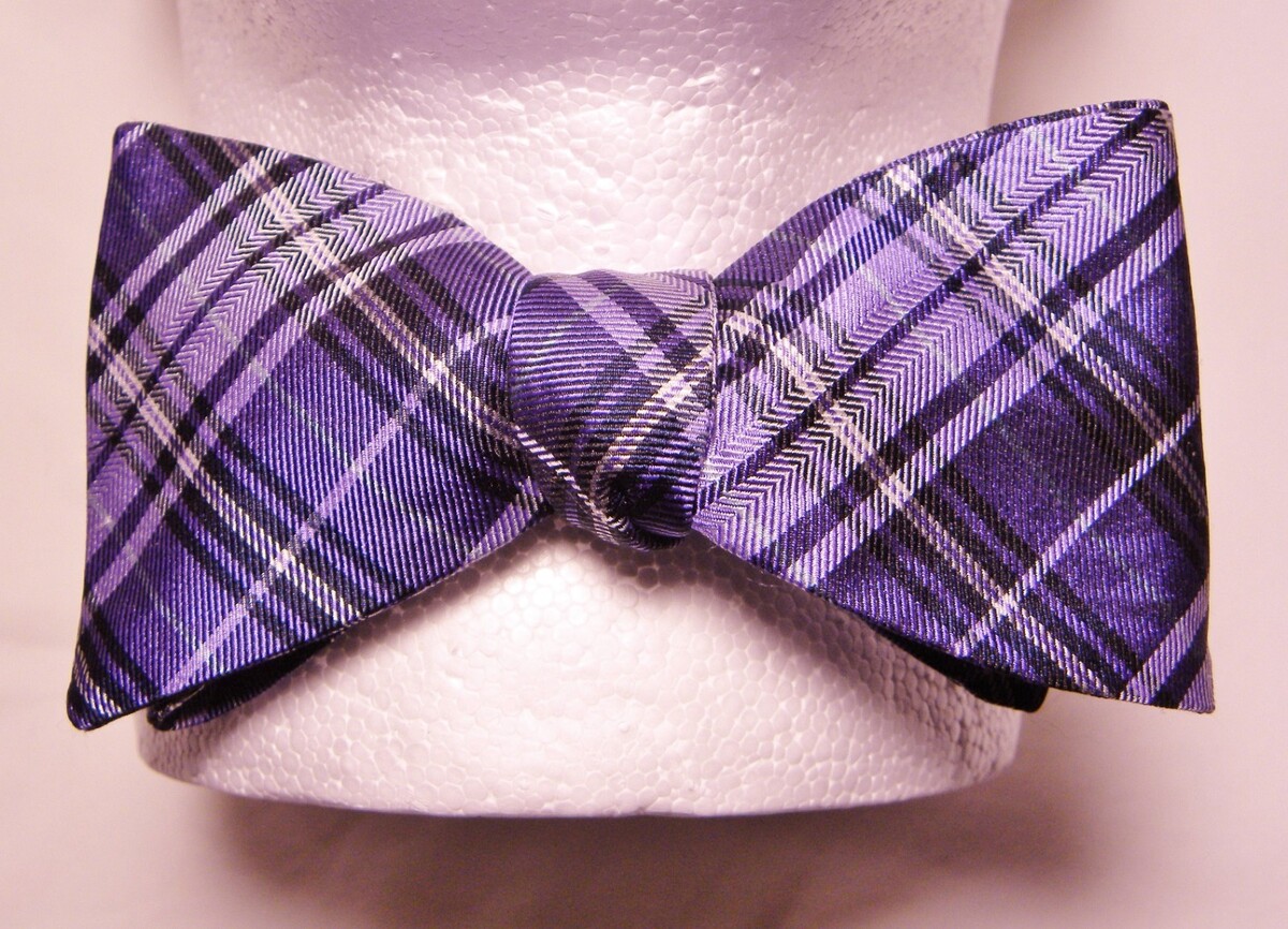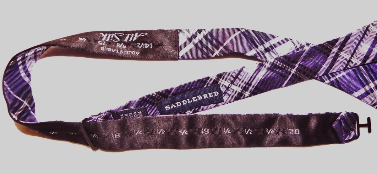 For Sale: Preowned Saddlebred 100% Silk Bowtie in dark/light purple plaid SELF-Tie. It is adjustable (sized) to a 20" neck...(see pics). Measurements: at the bow points: 2.5" across~~TOTAL length end to end: 39". It's in great condition.