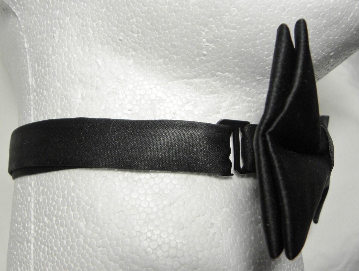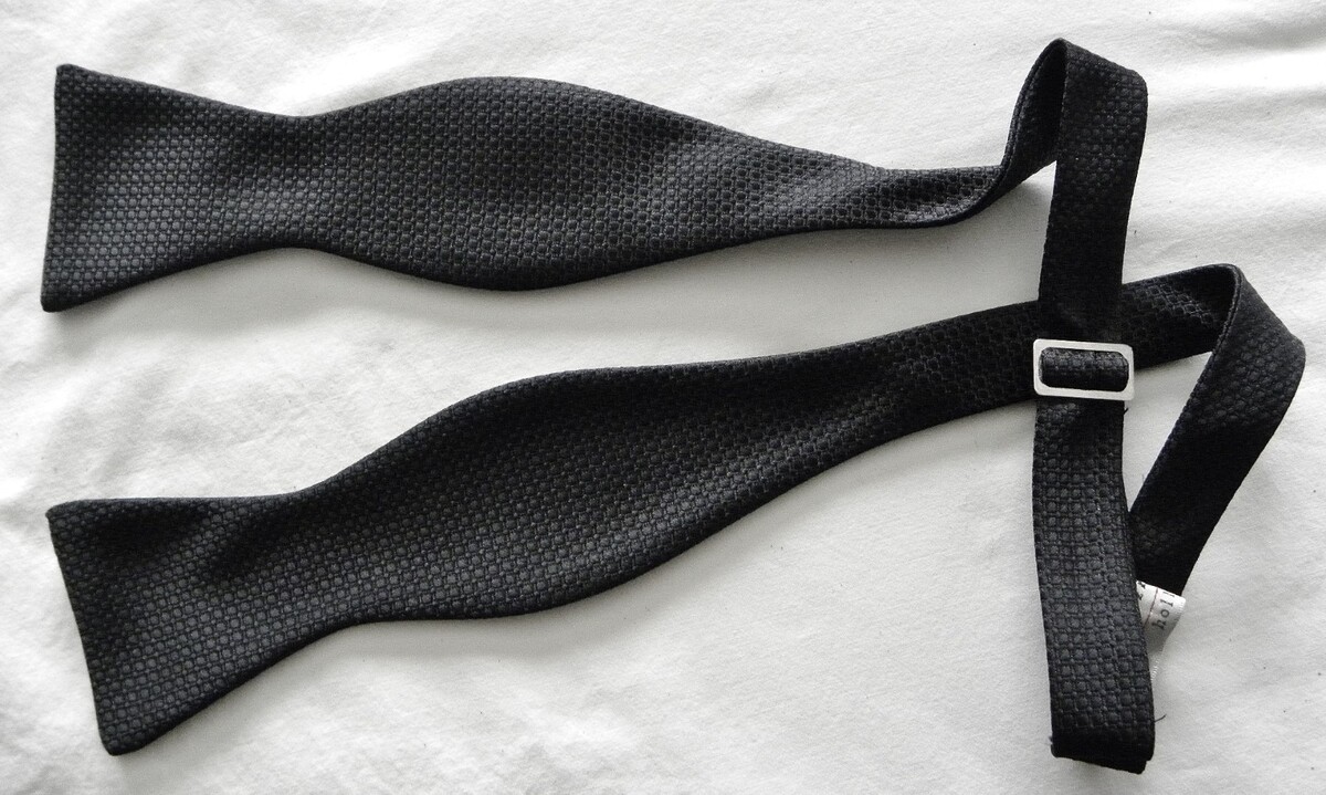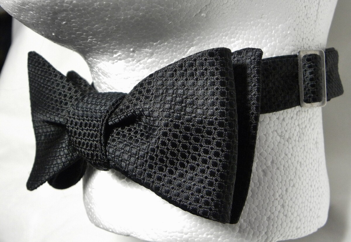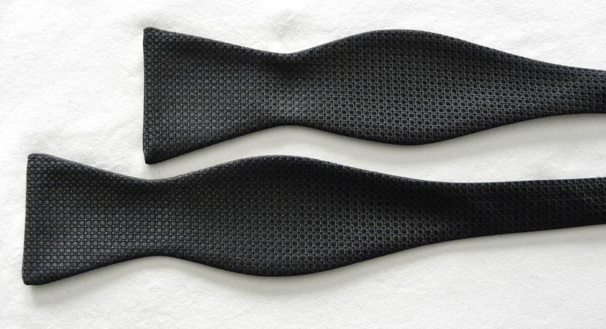 For Sale: Preowned Handmade Jon Vandyk (Holland) TEXTURED Black 100% Microfibre Polyester Bowtie. This formal SELF-Tie is adjustable. (see pics). Measurements: at the bow points: 2 3/8" across~~TOTAL length end to end: 36". It's in great condition.