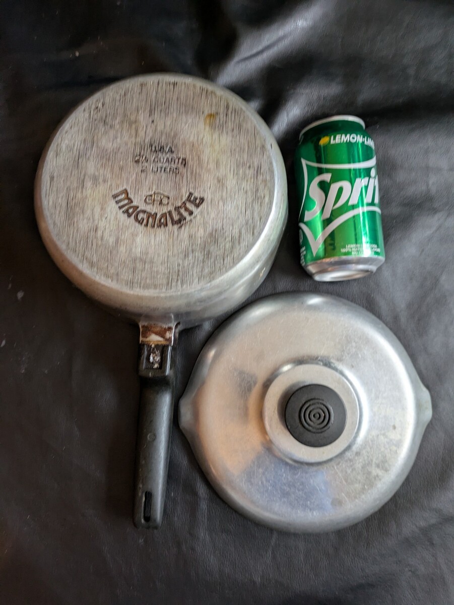 Le couvercle de casserole a double bec verseur GHC Magnalite de 2,5 litres de 2,5 litres est une batterie de cuisine de collection vintage fabriquee en aluminium aux Etats-Unis. Cette casserole ronde est dotee d'un couvercle de 7,5 pouces et a une capacite de 2,5 litres. Il est compatible avec les cuisinieres electriques et a gaz, ce qui en fait un ajout polyvalent a n'importe quelle cuisine. La marque Magnalite est connue pour ses ustensiles de cuisine de qualite, et cette marmite a sauce est une piece unique et originale qui constituerait un excellent ajout a toute collection.
