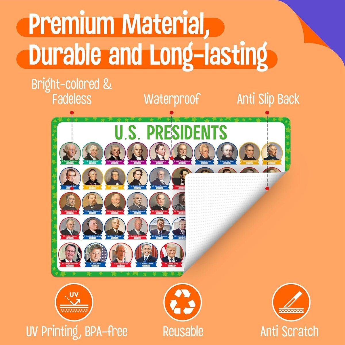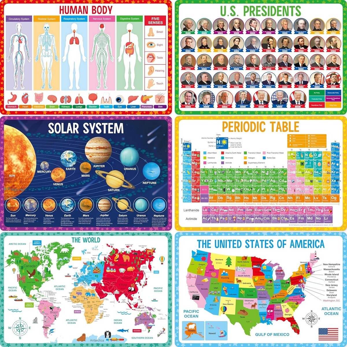 6 Unique Educational Themes: Each placemat features one of six captivating topics: Universe, Periodic Table of Elements, U.S. Presidents, Human Body, Map of the USA, and World Map. Transform mealtime into a stimulating learning journey.