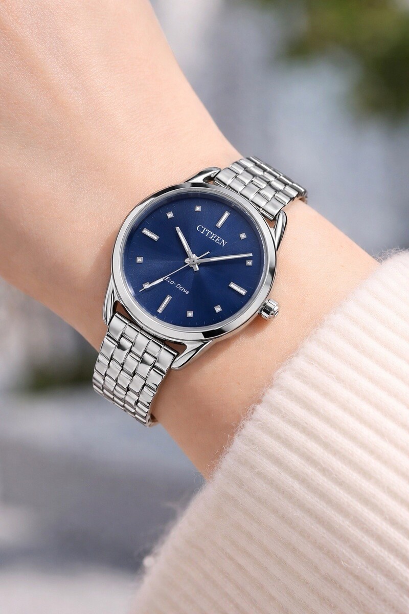 Elegant and effortlessly stylish, this Citizen Eco-Drive EM0500-73L women's watch features a stunning blue dial paired with a sleek stainless steel bracelet. Its refined 36mm case and slim profile offer a comfortable, modern fit perfect for everyday wear or special occasions.