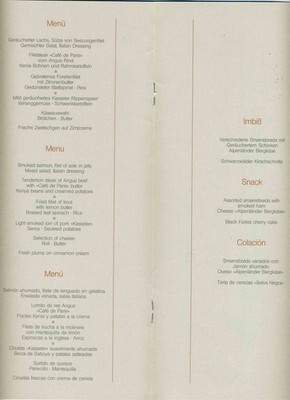 A 4 page Business Class Menu in a menu cover with a Pineapple from a Lufthansa flight in 1990. In German, English and Spanish. In very fine condition, measures about 6" x 11 3/4" when closed. .