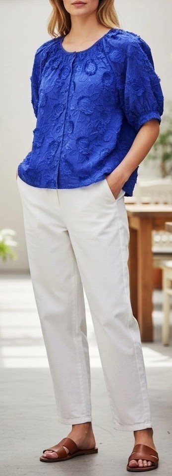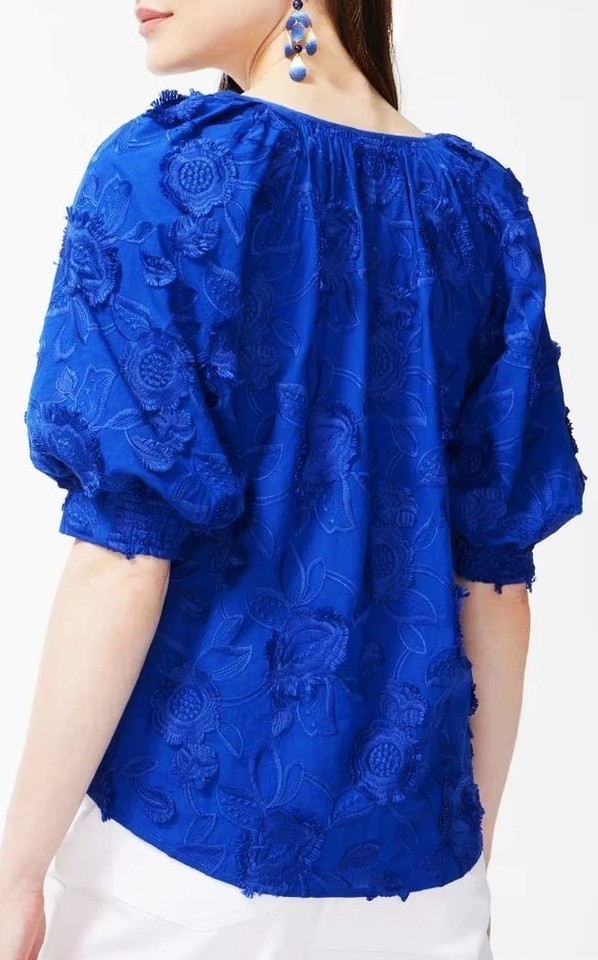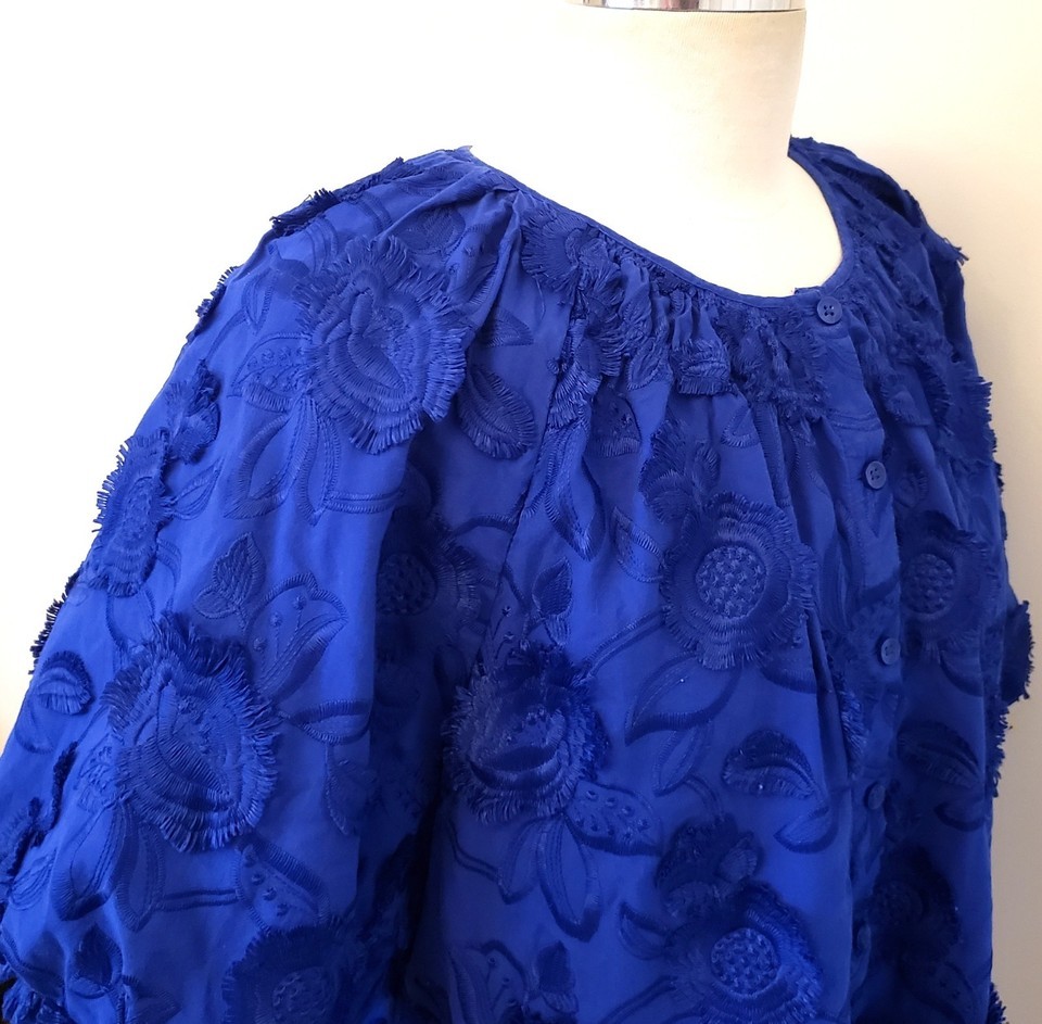 CHICO'S Floral Embroidered Button-Down Blouse Size-3/16 Royal Blue 100%Cotton