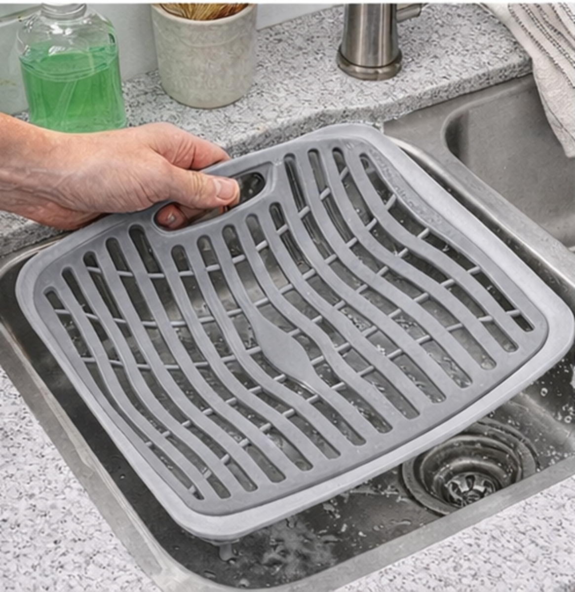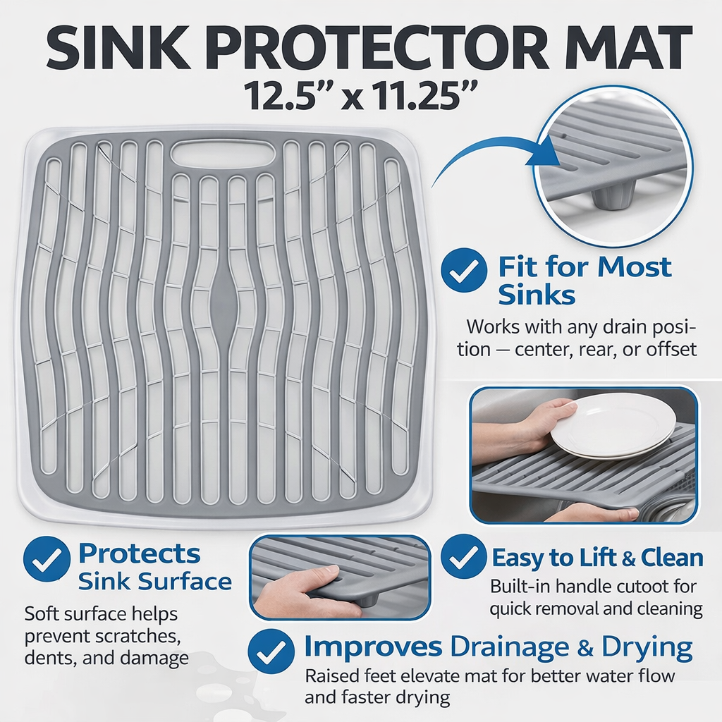 Protect your kitchen sink and dishware from everyday wear with this sink protector mat. Designed with a solid surface and raised feet, it helps prevent scratches, dents, and breakage while improving drainage and airflow.