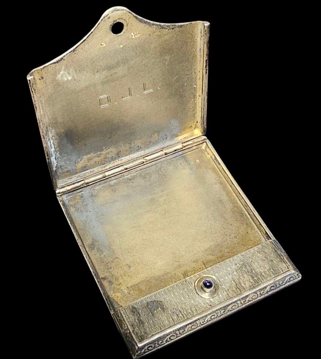 Antique European 900 Silver 39.68g Engraved Stamp Card Photo Case Sapphire Clasp