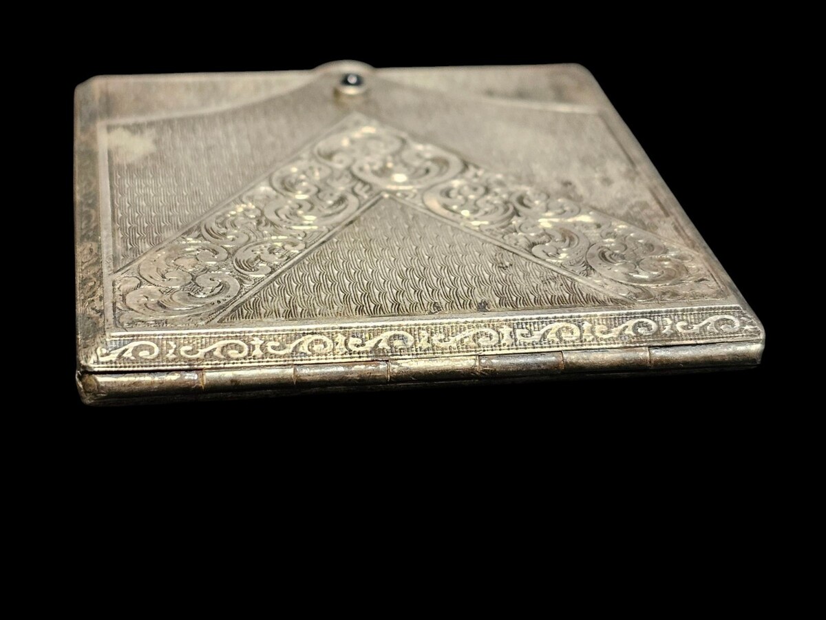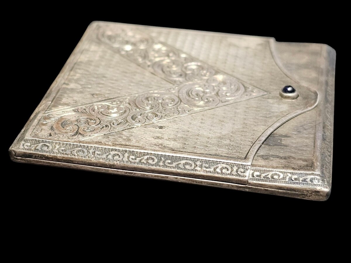 UP FOR SALE: Antique European 900 Silver 39 68g Engraved Stamp Card Photo Case Sapphire Clasp