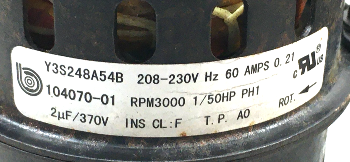 This is Broad-Ocean Y3S248A54B Draft Inducer Blower Motor 104070-01 208/230V 3000 RPM 1/50 HP used motor.