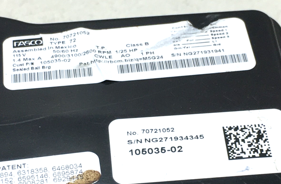 This is FASCO 70721052 Draft Inducer Blower Motor 105035-02 Type 72 115V 4900/3100/2600 RPM 1/25HP used part, excellent condition.