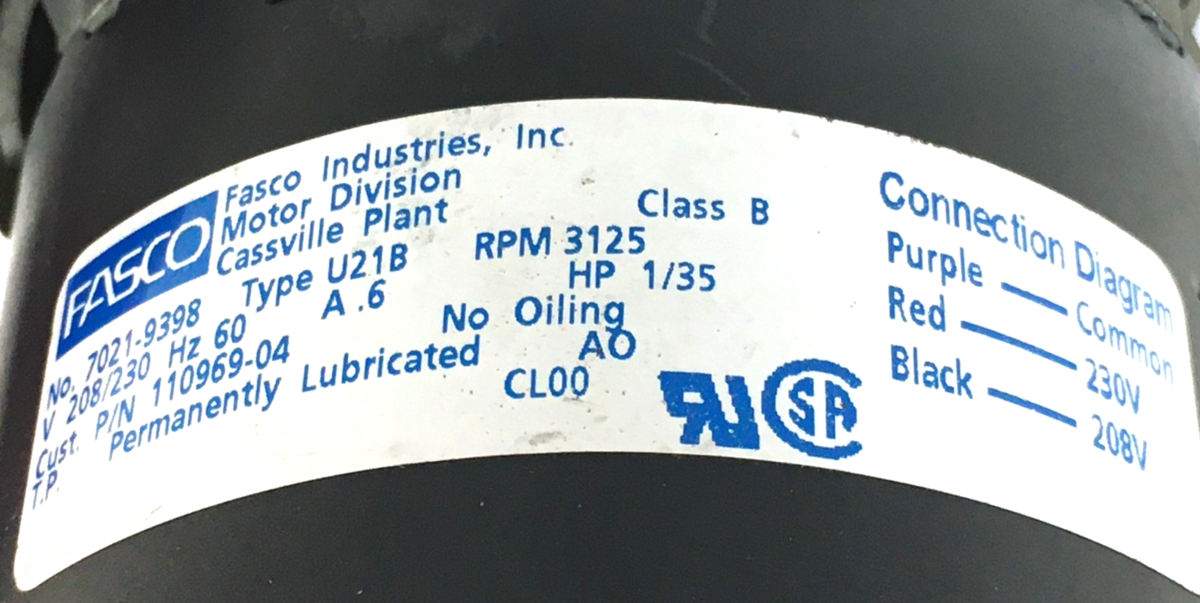 This is FASCO 7021-9398 Draft Inducer Blower Motor 110969-04 208/230V 1/35HP 3125 RPM used part.