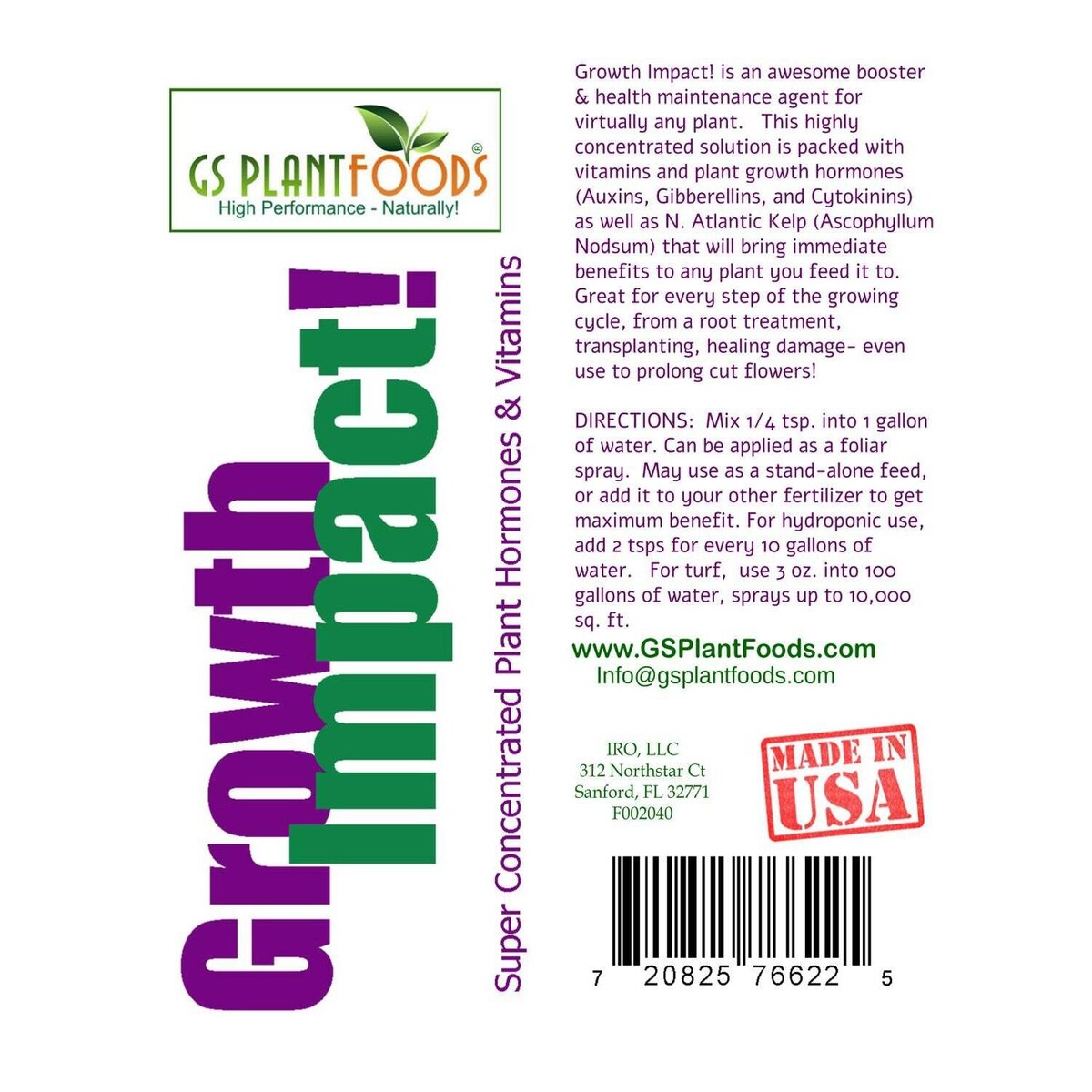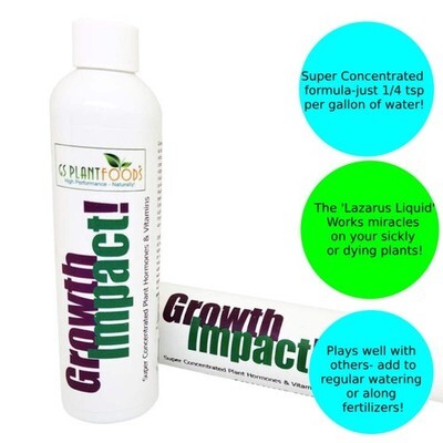 What is Growth Impact? GS Plant Foods Growth Impact is a non-toxic, super-concentrated plant growth booster enriched with natural plant hormones, vitamins, and enzymes. This 8-ounce formula revives weak or dying plants, reduces transplant shock, and promotes faster growth for lawns, hydroponics, and gardens. Mix OE tsp per gallon of water or fertilizer to activate enzymes, enhance photosynthesis, and support healthy, thriving plants. Key Benefits: Eliminates Transplant Shock: Protects new sod, seedlings, and delicate transplants from stress. Revives Plants: Restores weak or dying plants and supports turf regeneration. Boosts Photosynthesis: Enhances enzyme activity for faster growth, greener leaves, and stronger roots. Universal Compatibility: Works with any fertilizer, suitable for foliar sprays, hydroponics, or soil drenching. Safe and Organic: Non-toxic formula, safe for pets, pollinators, and organic gardening. How to Use Effortless Application: Dilute: Add OE tsp to 1 gallon of water or fertilizer. Apply: Foliar Spray: Mist leaves for instant nutrient uptake. Hydroponics: Mix into nutrient solutions for robust growth. Soil Drench: Water plants to revitalize roots and soil.Pro Tip: Use weekly for stressed plants or monthly for maintenance! How Growth Impact Supports Plant Health Growth Impact contains a unique blend of plant hormones, vitamins, and natural enzymes that stimulate root development, improve nutrient absorption, and enhance photosynthesis. By reducing stress from transplanting and environmental factors, it helps plants recover faster, grow stronger, and maintain vibrant, healthy foliage. Regular use supports long-term plant resilience and boosts overall garden productivity. If you want to try a formula that strengthens roots and boosts overall plant performance, check out our Root Ruckus!