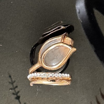 Make a bold yet elegant statement with this beautifully designed 14K gold plated ring. Featuring a soft cream cabochon-style center and a sparkling rhinestone-accented band, this piece creates a stunning layered look that mimics stacked rings in one effortless design.