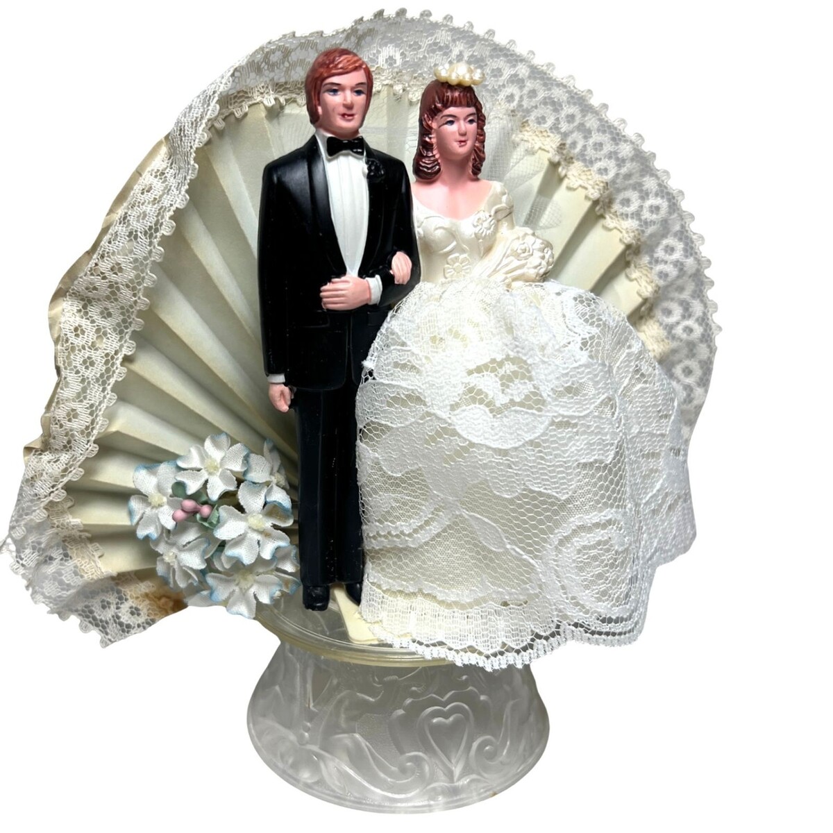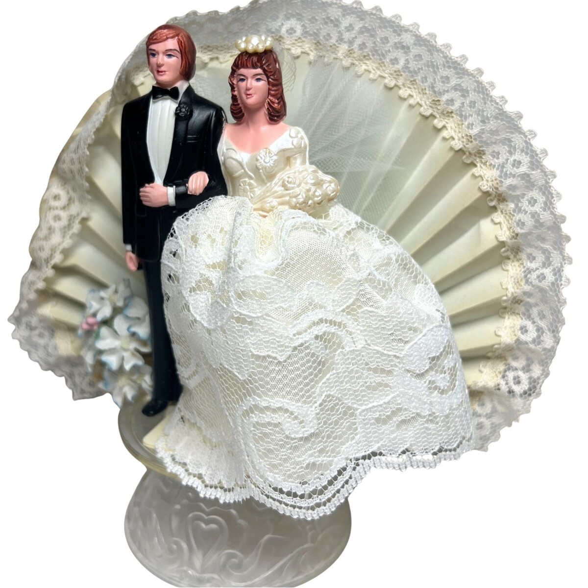 Vintage Wedding Cake Topper Bride Groom Lace Paper Fan Plastic Couple Stand 6.5"