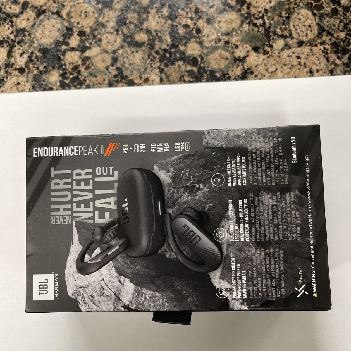 Included components: JBL Endurance Peak II, 3 sizes of eartips, Enhancer, Type-C charging cable, Charging case, Warranty/Warning, Quick Start Guide/Safety Sheet