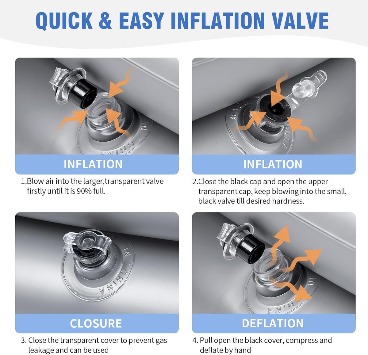 Quick Inflation: Dual air valve design allows for inflation by mouth or pump in under 3 minutes, while reducing volume by 80% when deflated for easy storage.
