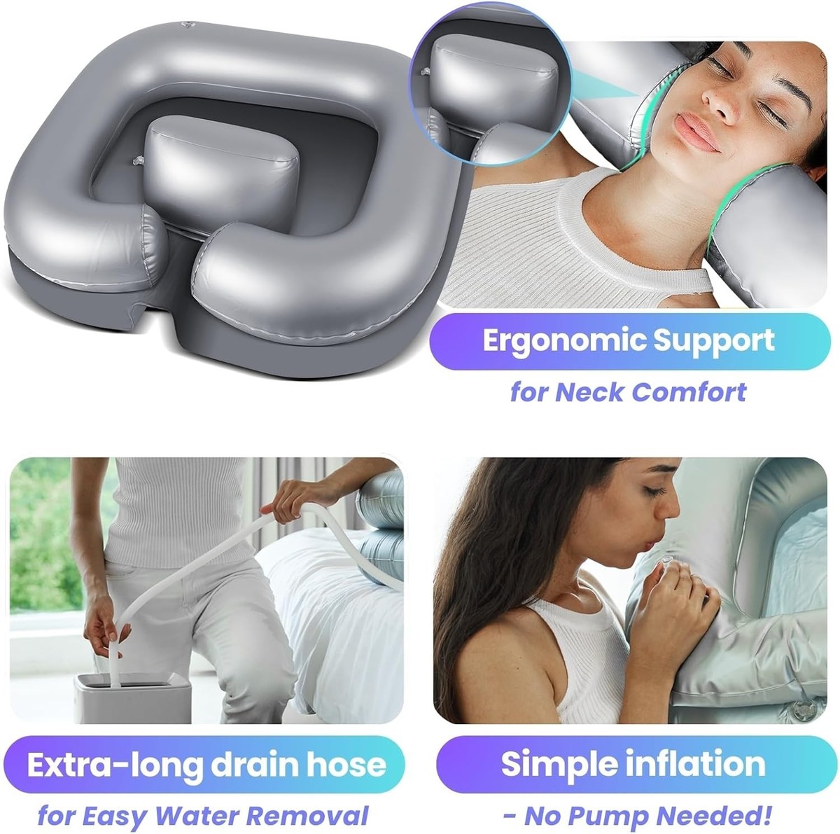 Features: Portable,Inflatable,Lightweight,Easy to Use,Collapsible,Leak-proof,Mess-Free Washing,Deep Basin,Ergonomic Neck Support,Extra-long Drain Hose