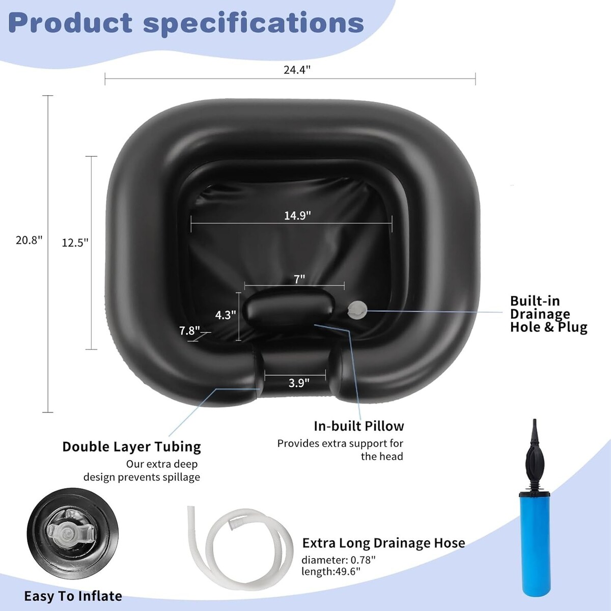 Features: Portable,Neck Support,Easy to Use,Inflatable,Folds for Storage,Extra Long Drain Hose