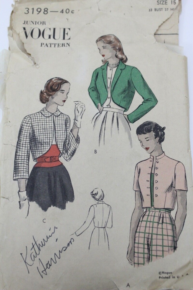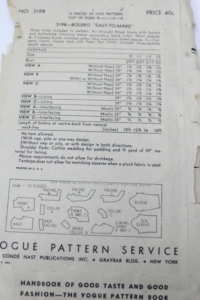 VTG 1940s Sewing Pattern Vogue #3198 Size 15 Bust 33 Hip 37 Bolero Jacket