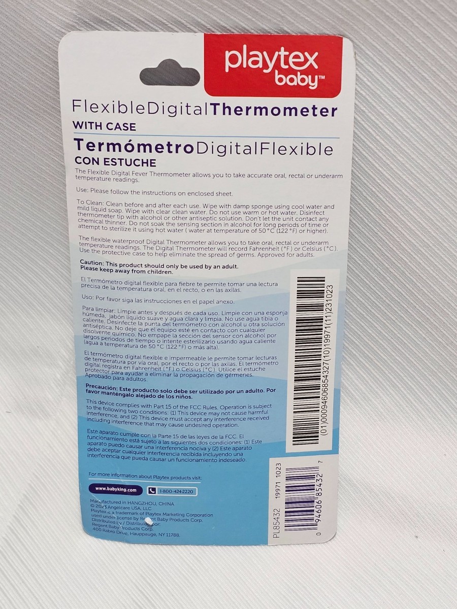 Description of item: This Playtex Baby Flexible Digital Thermometer (Model PL85432) offers fast, accurate temperature readings and is designed with comfort and versatility in mind. The flexible tip makes it ideal for use with babies, children, and adults. It can be used for oral, underarm, or rectal readings, making it a reliable all-in-one thermometer for home use. The easy-to-read digital display ensures quick results when you need them most.