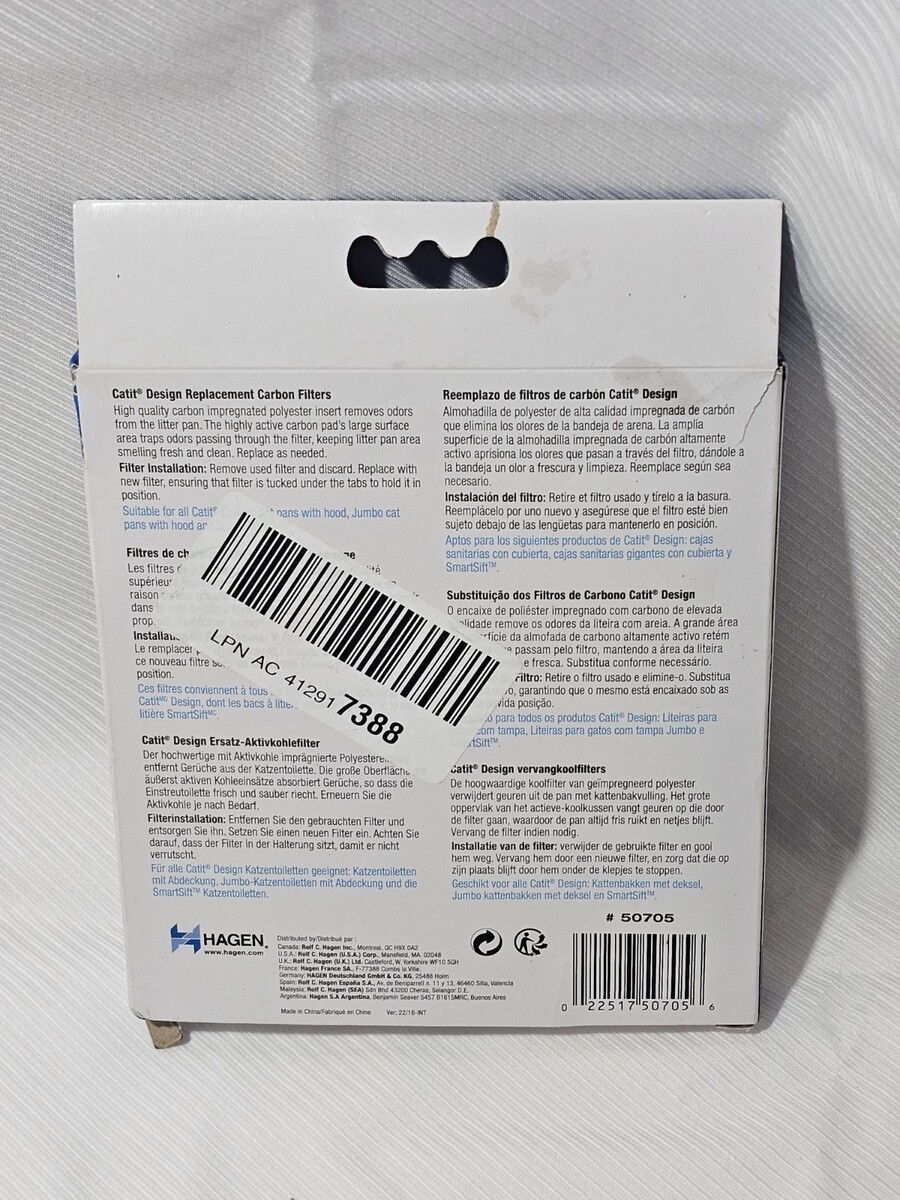 Description of item: This listing is for a Catit Design Replacement Carbon Filter set, intended for use with Catit hooded cat litter boxes. These carbon-impregnated filters help reduce litter box odors by trapping smells as air passes through the hood. Designed to fit Catit Design litter pans with a cover, including jumbo and SmartSift-compatible models (as shown on packaging). Item shown is exactly what you will receive. Please verify compatibility with your specific Catit litter box before purchasing.