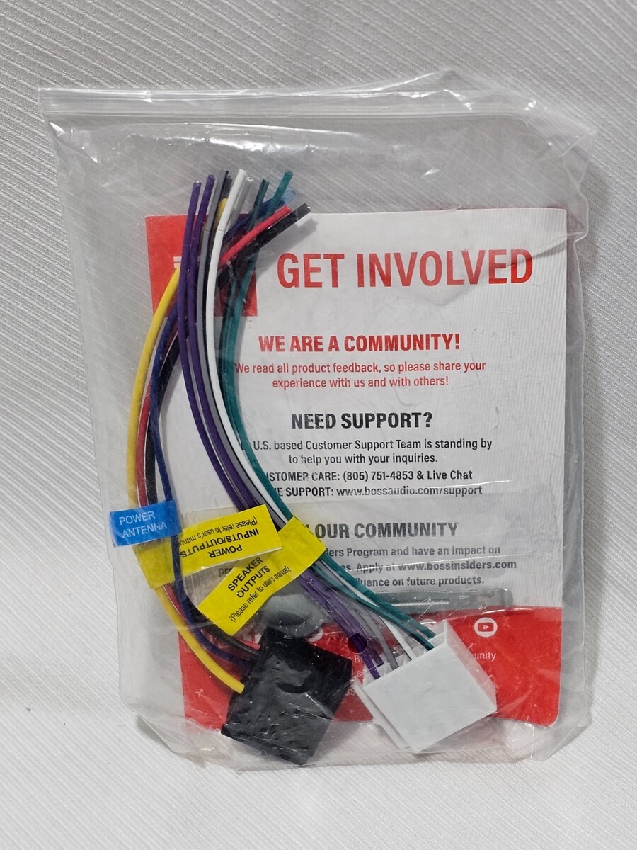 Included is the factory wiring harness and user manual for the Boss 611UAB Bluetooth AM/FM media receiver. Ideal for installers or anyone needing OEM replacement parts.