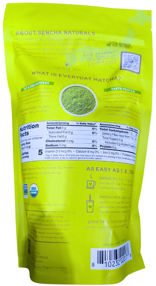 Sencha Naturals 100% Organic Matcha Green Tea Powder 12 Ounce Bag EXP 03/2027