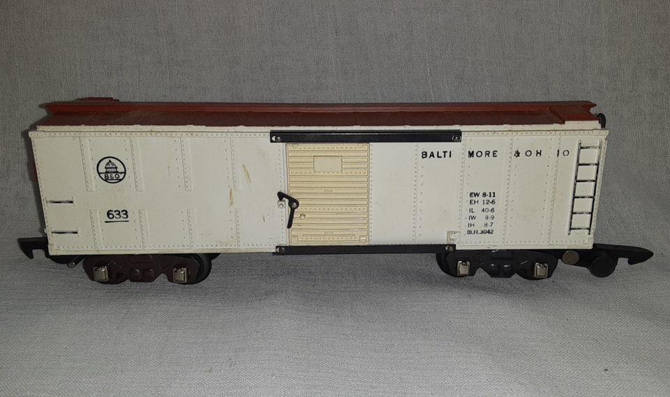 This is a Vintage American Flyer No.633 Baltimore Ohio Box Car. The top and ends are Tuscan red and it has white sides. This car has link couplers. It has moving doors and latches. This item is used. Please refer to the pictures for signs of use. Otherwise it is in good condition. It may need cleaned. There is no box for this car.
