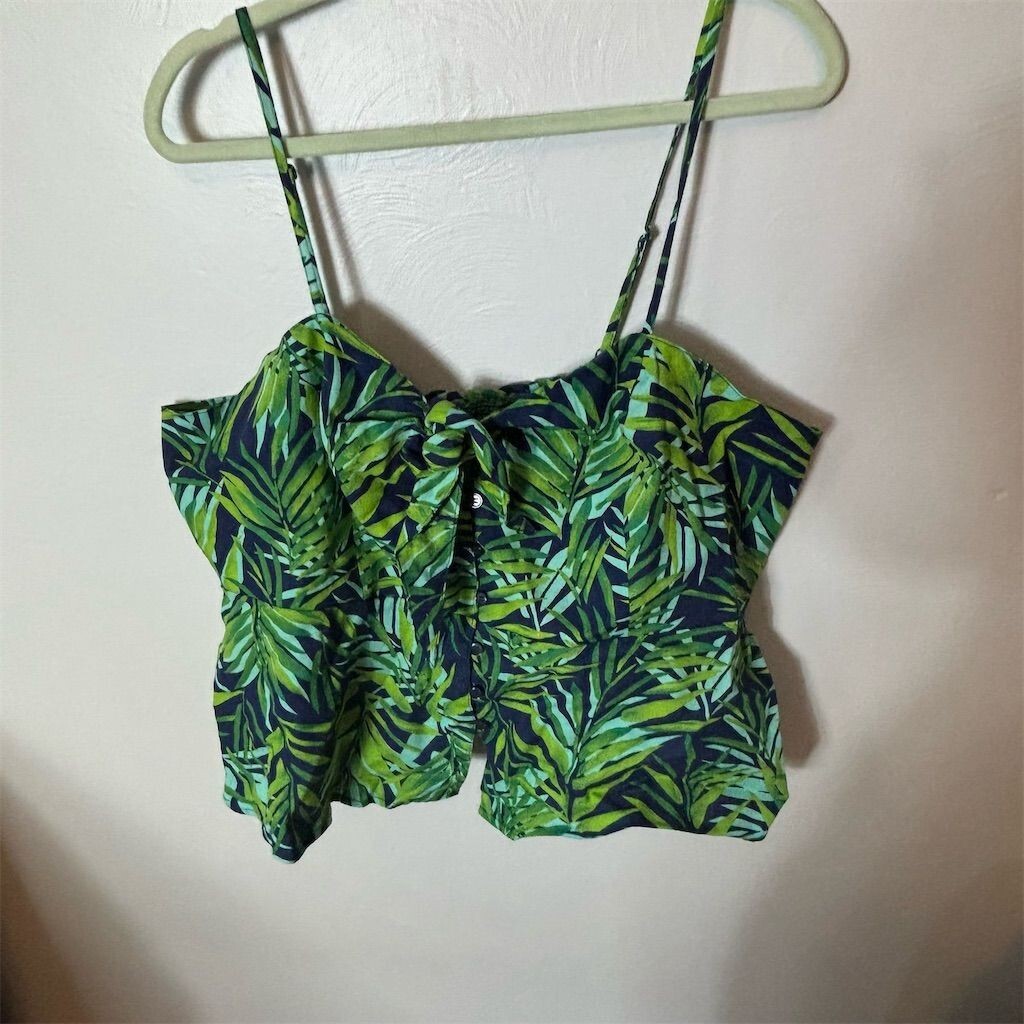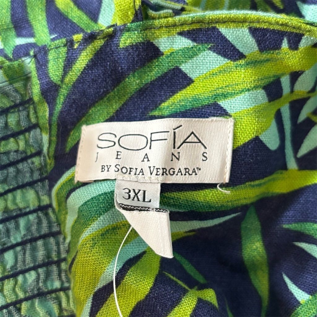 Discover effortless style with the Sofรญa Jeans Women's Camisole Blouse in a refreshing green floral pattern. Perfect for sunny days, this blouse combines the breathability of linen and viscose with a flattering peplum silhouette. The adjustable spaghetti straps and charming knot front detail add a touch of elegance to your casual summer wardrobe. Designed for comfort and versatility, this 3XL blouse is machine washable, making it easy to care for. New with tags, it's ready to become your go-to piece for any casual occasion.