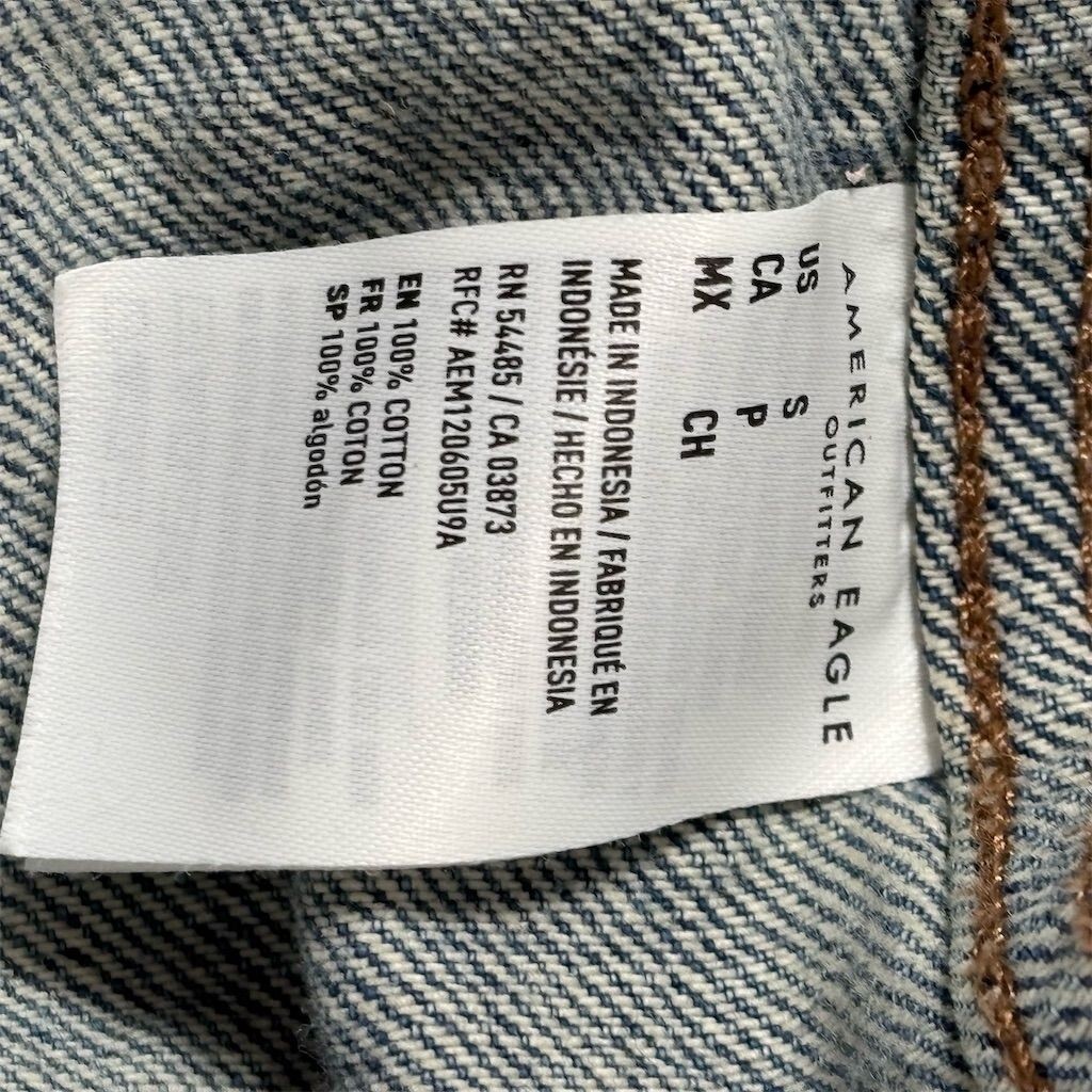 Keywords: American Eagle, women's jacket, size S, cotton jacket, blue jacket, distressed detailing, button-up, chest pockets, vintage jacket, casual wear, layering, pre-owned, Indonesia, solid pattern, basic style.