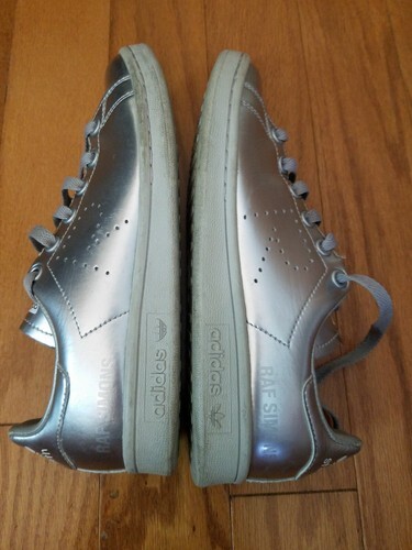A vendre est une paire de baskets Adidas RAF Simons X Stan Smith legerement utilisees en argent metallise Sz 4.5.