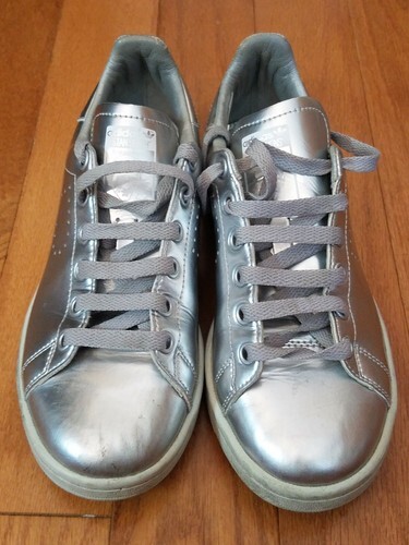 In vendita c'e un paio delicatamente usato di scarpe da ginnastica Adidas RAF Simons X Stan Smith Metallic Silver Sz 4.5.