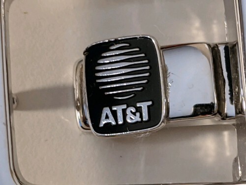 In vendita c'e una fibbia per cintura in peltro argento con pubblicita AT T vintage come nuova con logo nero che misura 2 pollici di larghezza.