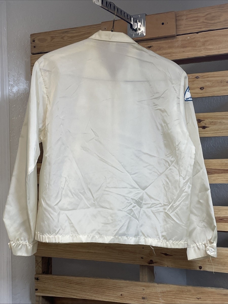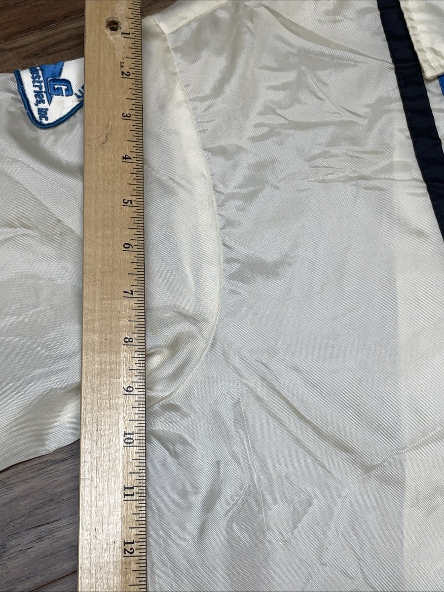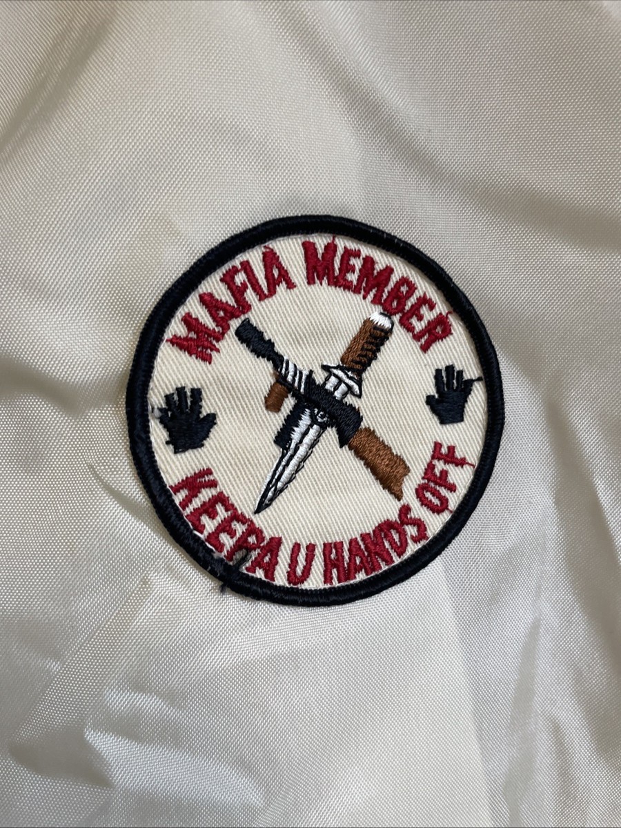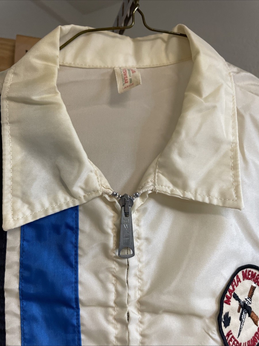 These jackets were highly popular promotional items in the 1960s and 70s, often customized for automotive brands, local racing clubs and speedways. This one has two customized patches on it one triangle white and blue patch saying ?symbol of quality Guerdon Industries, Inc.? and a circle with red, black and white saying ?mafia member keepa u hands off?. One stain one the sleeve left sleeve cuff, the shoulder patch has some stitching unravelling.