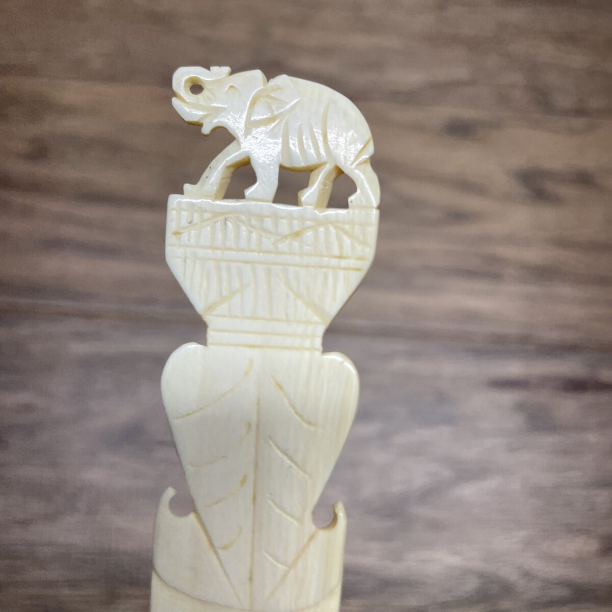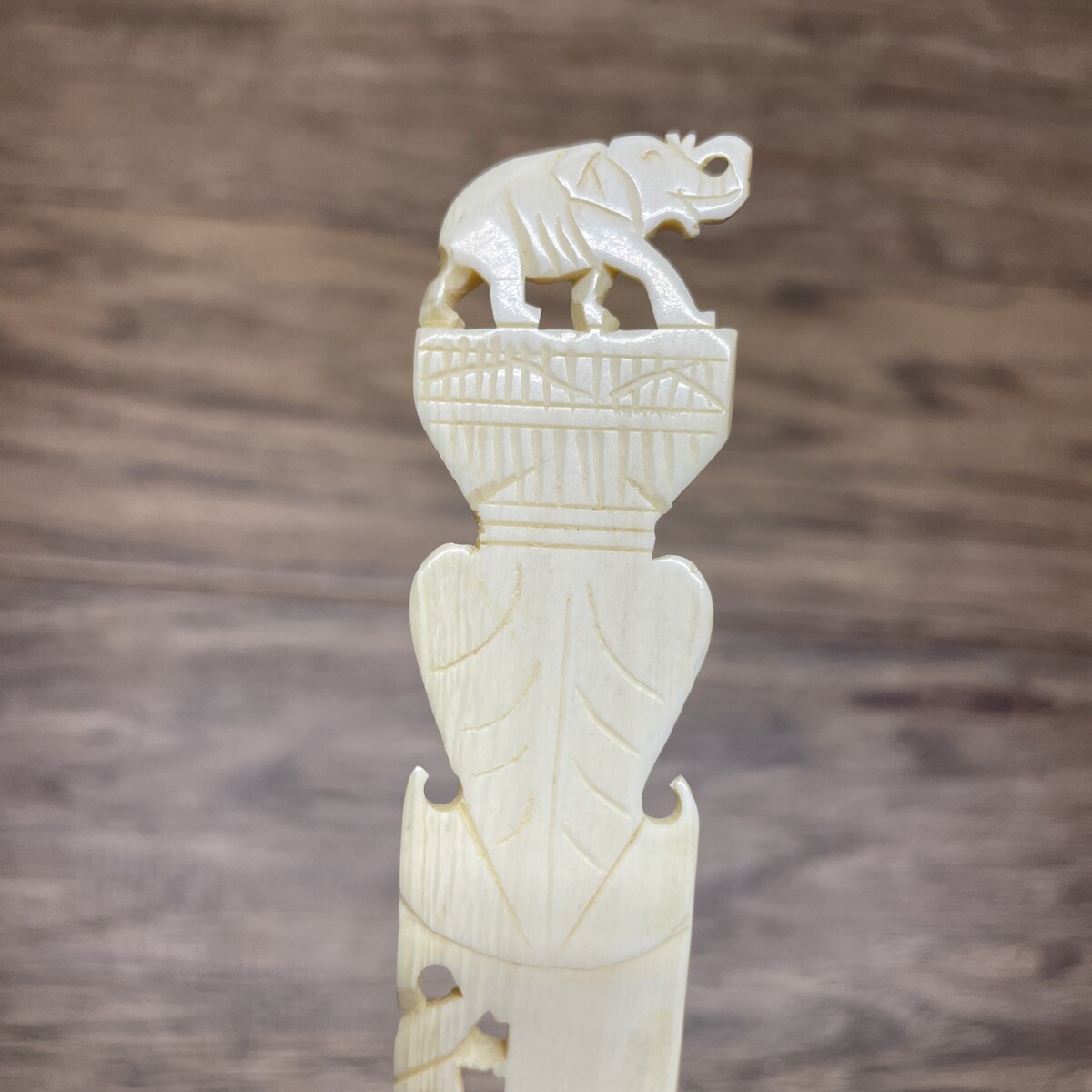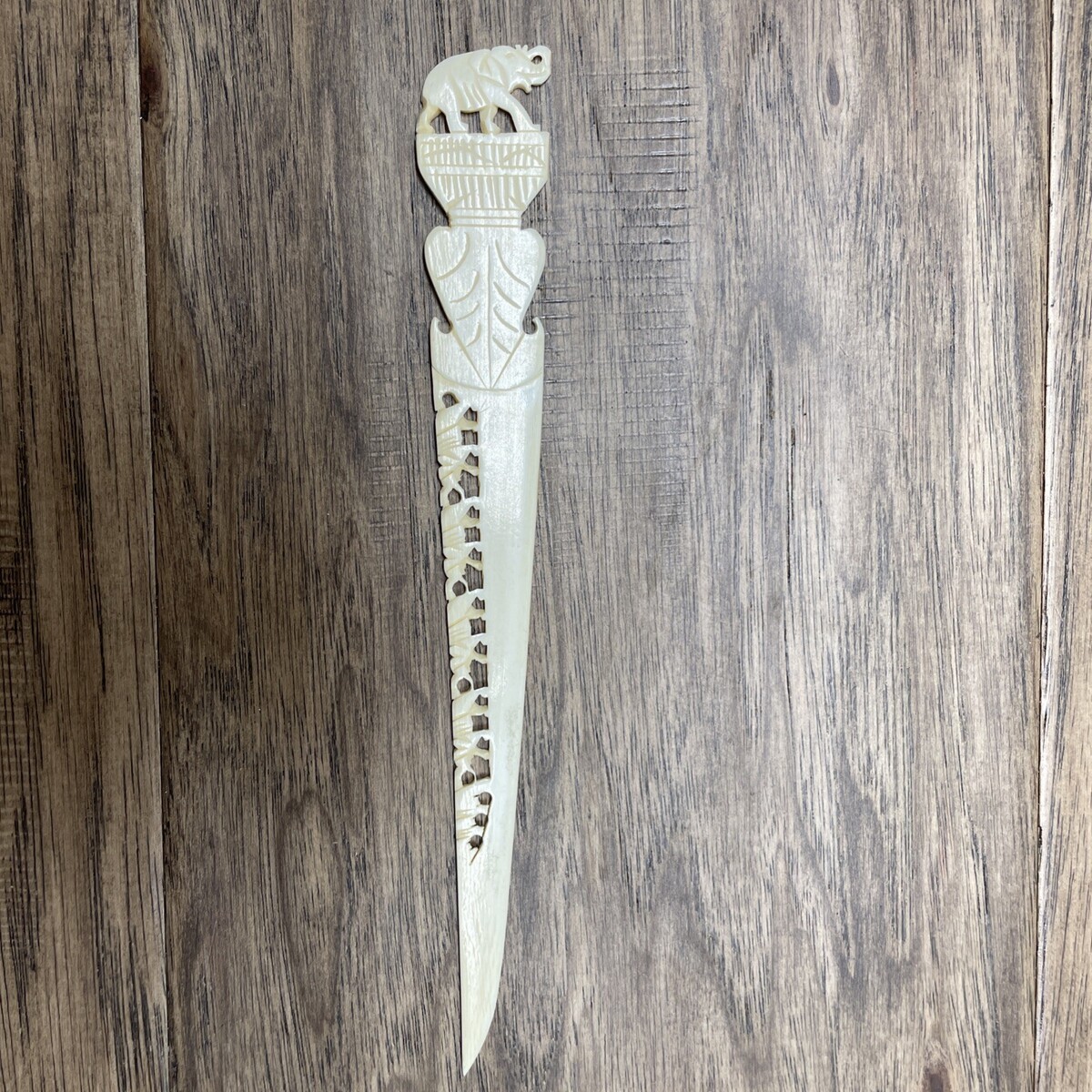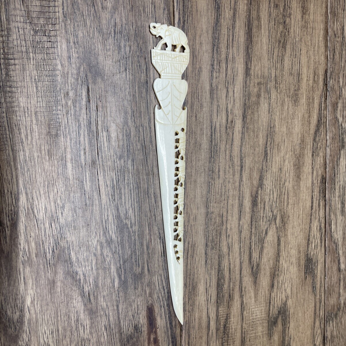This vintage letter opener from India depicts lucky elephants, showcasing intricate craftsmanship and a unique design. Handmade before 1956, this piece is made from an unknown type of natural material, adding to its charm and authenticity. Its vintage nature makes it a valuable collectible for those who appreciate traditional artistry and unique desktop items. Ideal for letter enthusiasts or collectors of vintage items, this carved letter opener is a rare and special piece that adds character to any workspace or collection.