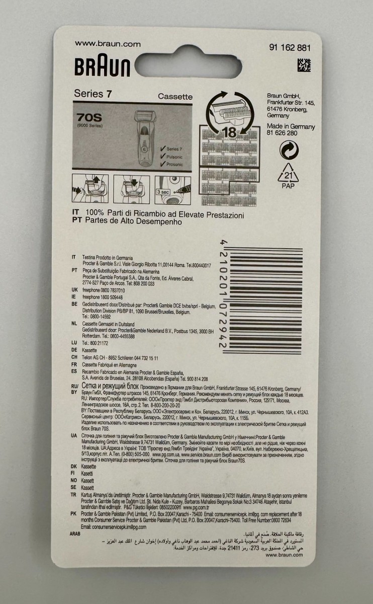 This listing is for a genuine Braun Series 7 70S replacement cassette, brand new in original retail packaging. The packaging confirms this is an authentic OEM Braun part, manufactured in Germany and designed to restore shaving performance to factory standards.