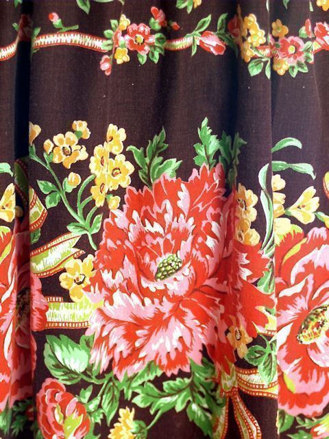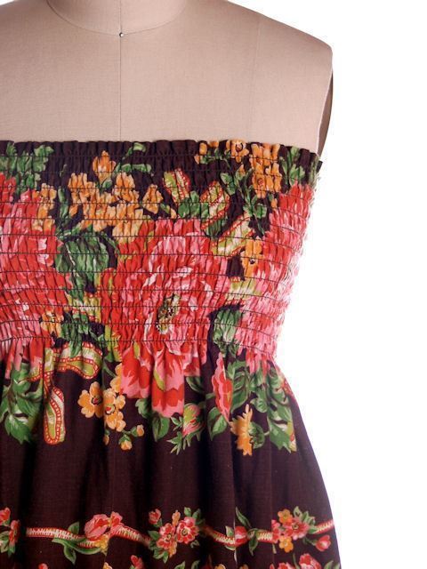 Vintage 1970s brown cotton border-print maxi dress or skirt, size S?L (bust 30?36?, hips 58?), featuring oversized red poppies with yellow and green accents. Designed with an elastic smocked bodice/waistline, allowing it to be worn as either a strapless maxi dress or a maxi skirt. Unlabeled, with selvedge edge serving as the hem.
