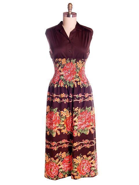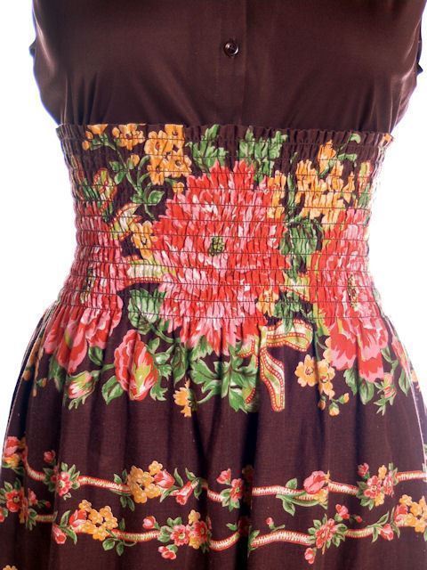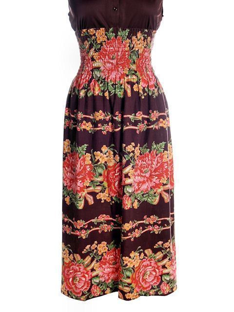 VTG 1970s Brown Cotton Maxi Dress or Skirt Border Print Poppies Smocked Sz S–L