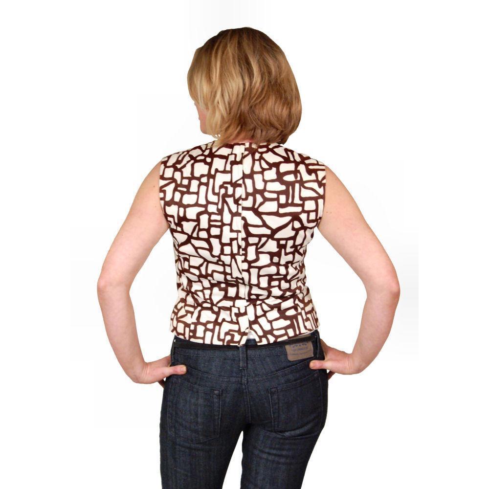 Vintage 1960s sleeveless blouse, size M (bust 38?, waist 32?), in a chic brown and white abstract print. Designed with a jeweled neckline for sparkle, a full back zipper, and fully lined in acetate. A simple yet striking piece with mid-century flair.