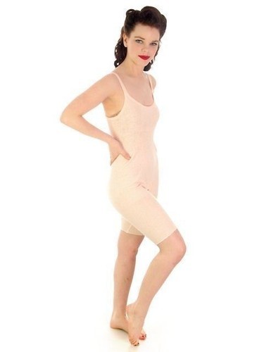 Vintage WWI/early 1920s ?step-in? underwear by Globe Knitting Works, size 38 (bust 32?, waist 25?, hips 32?), crafted in pale peach cotton knit. Designed with a tank-style top, ribbed body, and open gusset style. A scarce survival of early 20th-century intimate apparel.