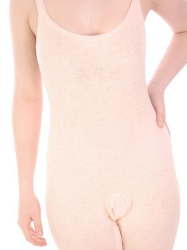Cotton blend ribbed knit body; tank-style top; open gusset design; Globe Knitting Works ?The Globe Tailor Made? label.