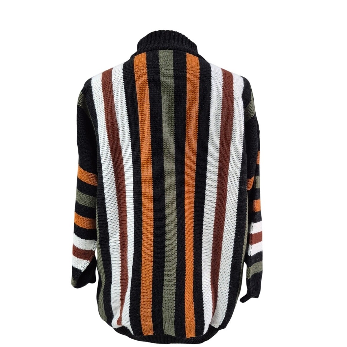 Vintage 1980s?1990s Private Eyes striped sweater, size L (chest 52?, waist 40?48?), crafted in soft acrylic knit. Designed in a bold palette of black, orange, cream, green, and brown stripes with ribbed cuffs and hem. A unisex oversized fit that seems never worn.