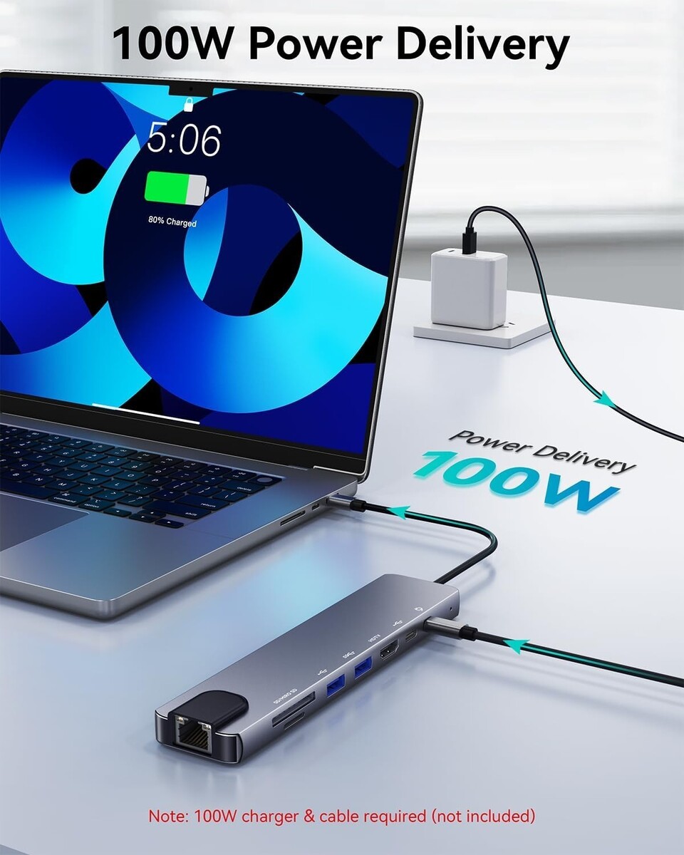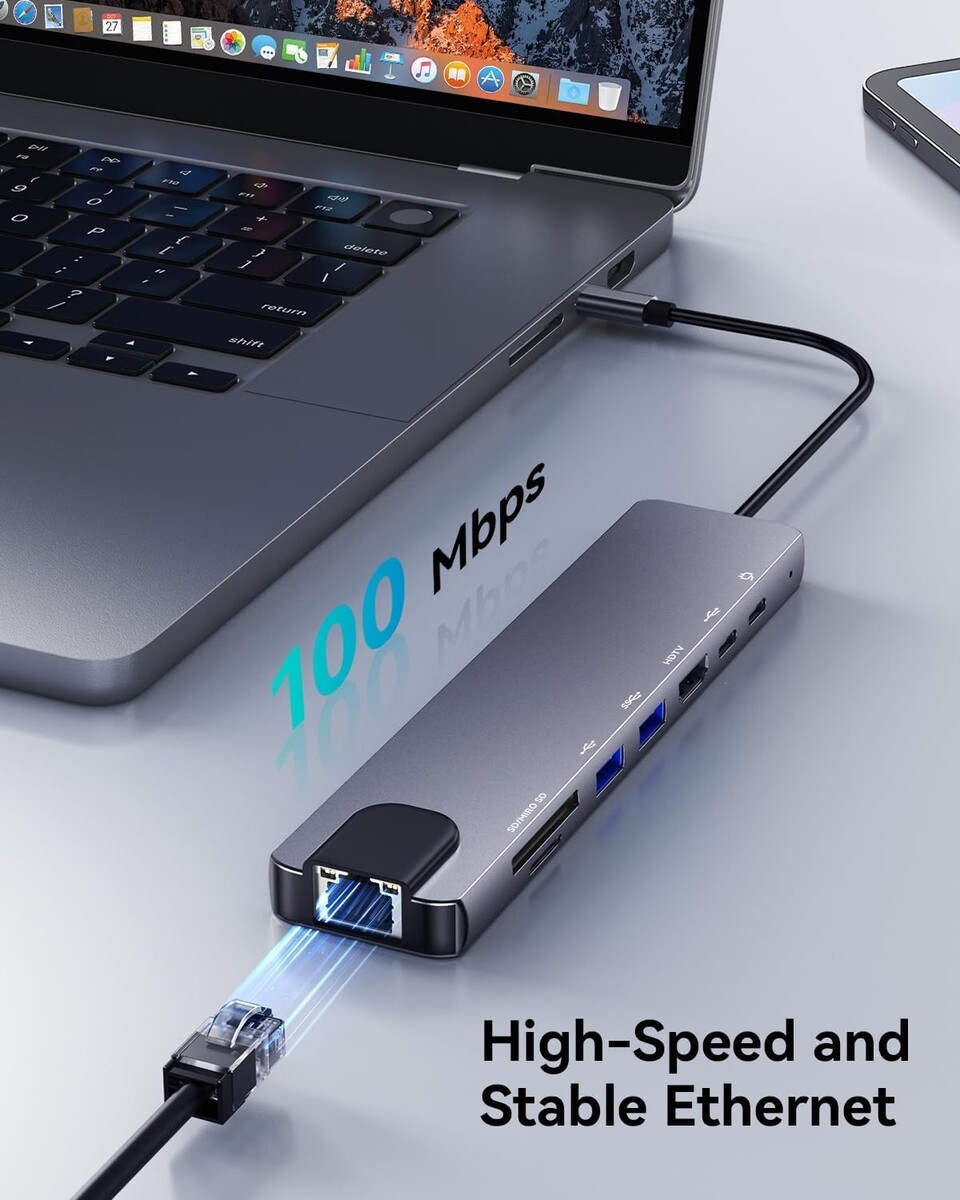 ?8-in-1 USB-C Hub with Ethernet?Expand a single USB-C port into 8 essential ports:1HDMI (4K@60Hz), 1USB-C PD (100W), 1USB-C data (5Gbps), 1USB-A 3.0, 1USB-A 2.0, 1Ethernet (100Mbps), 1SD, 1TF. More functional than typical 7-in-1 hubs?ideal for work, office, meeting and travel.